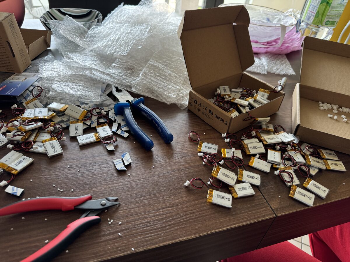 Back in 2024 we had a separate adventure for the V1 Badge. And by we, I mean Loris. One of the things inherited from the original design is that the Adafruit LiPo battery connectors are wired up in reverse polarity compared to what you typically find on the market. Loris was unable to order from Adafruit to Italy, and thus sourced them from a European vendor. Due to the connector being reversed, he then had to convert each of the 125 battery connectors over to the right polarities by destroying the connector housing, and inserting the crimped wires into a new one: